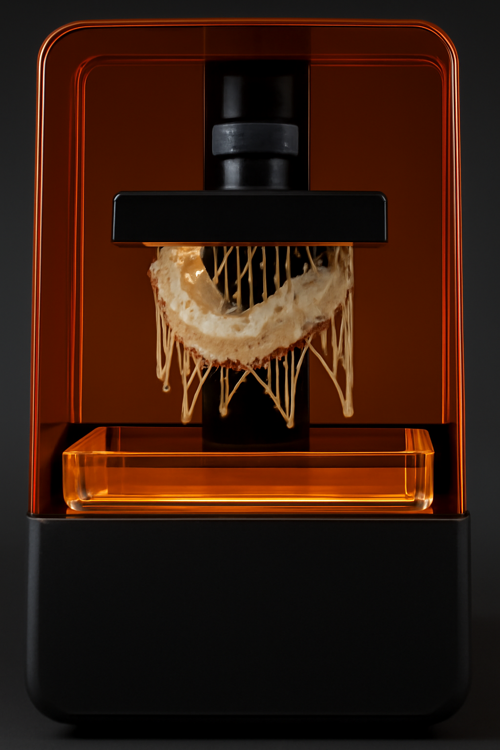 - پخت لایه به لایه: در هر مرحله، لیزر یا پروژکتور UV یک لایه از رزین را با توجه به مدل دیجیتالی سخت میکند. هر لایه از مدل بهطور جداگانه پخته شده و پس از تکمیل یک لایه، سطح برای چاپ لایه بعدی آماده میشود.